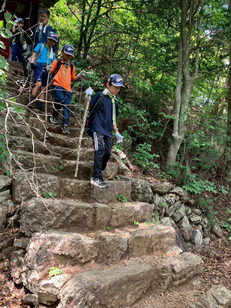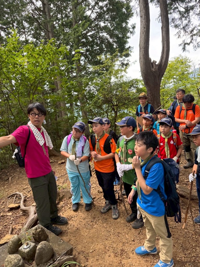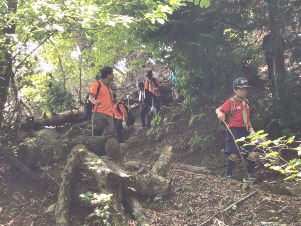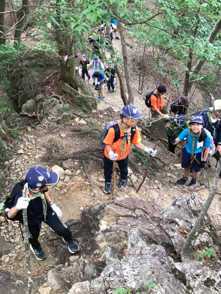 帰路のほうが、岩あり根っこあり、まるでアスレチック滑り台。険しい道ほどスカウトたちの冒険心に刺さるのか、全身で山道を楽しんでいました。足運び一つ手を付く位置一つで進みが変わるので、五感と頭脳がフル回転していたのかなと思います。いい顔をしていました。