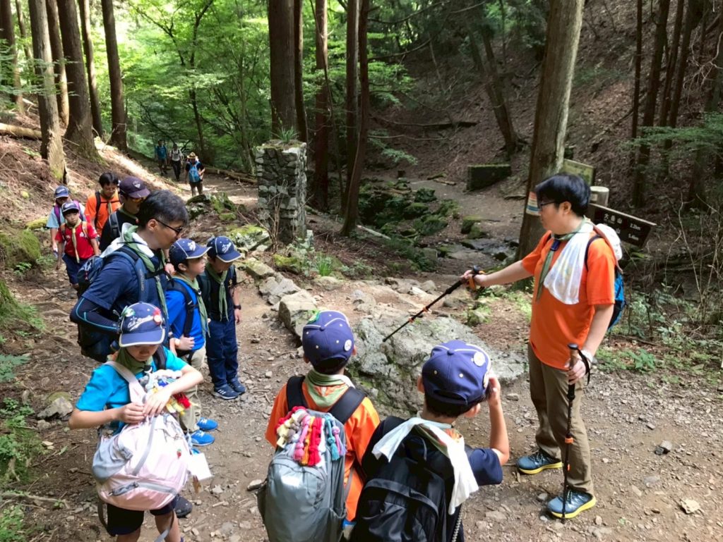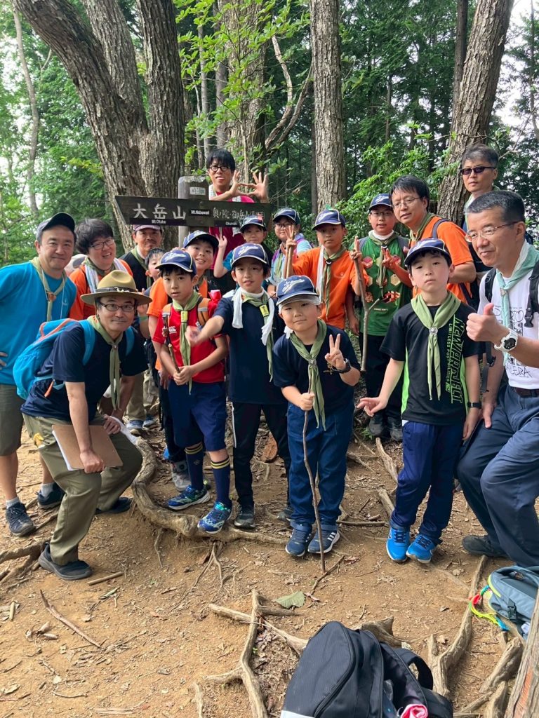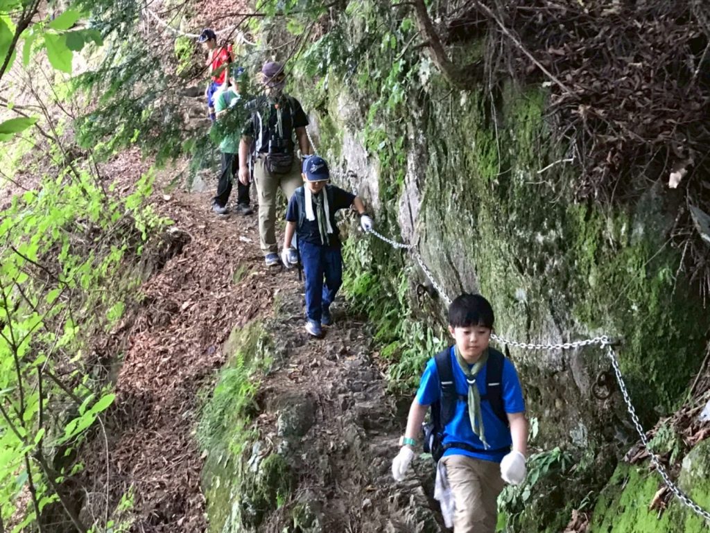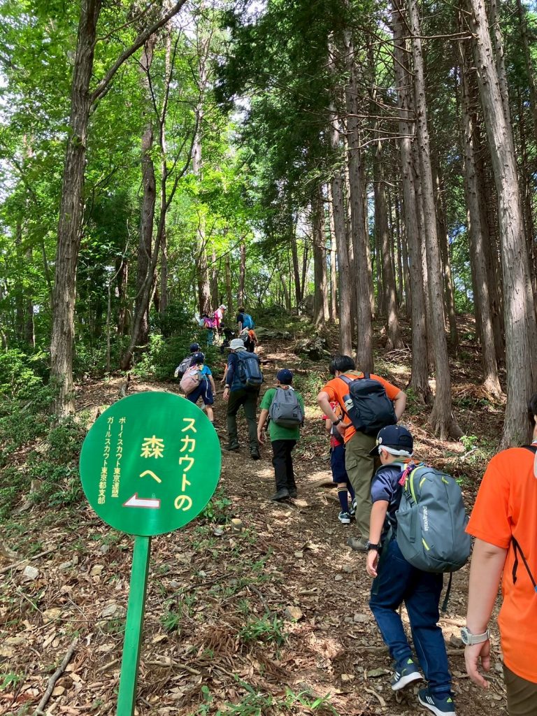 帰路のほうが、岩あり根っこあり、まるでアスレチック滑り台。険しい道ほどスカウトたちの冒険心に刺さるのか、全身で山道を楽しんでいました。足運び一つ手を付く位置一つで進みが変わるので、五感と頭脳がフル回転していたのかなと思います。いい顔をしていました。