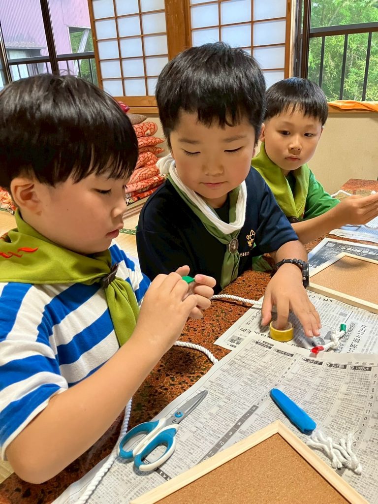 宿について昼食をとったとは、工作タイムです。今年は、『ノッティングボード』。カブスカウトで学ぶロープ結びを使って作ります。まずは、自分たちの一年間を思い出しながらロープ結びに取り組み、後半はビーバースカウトたちに結びを教えてあげる交流会です。