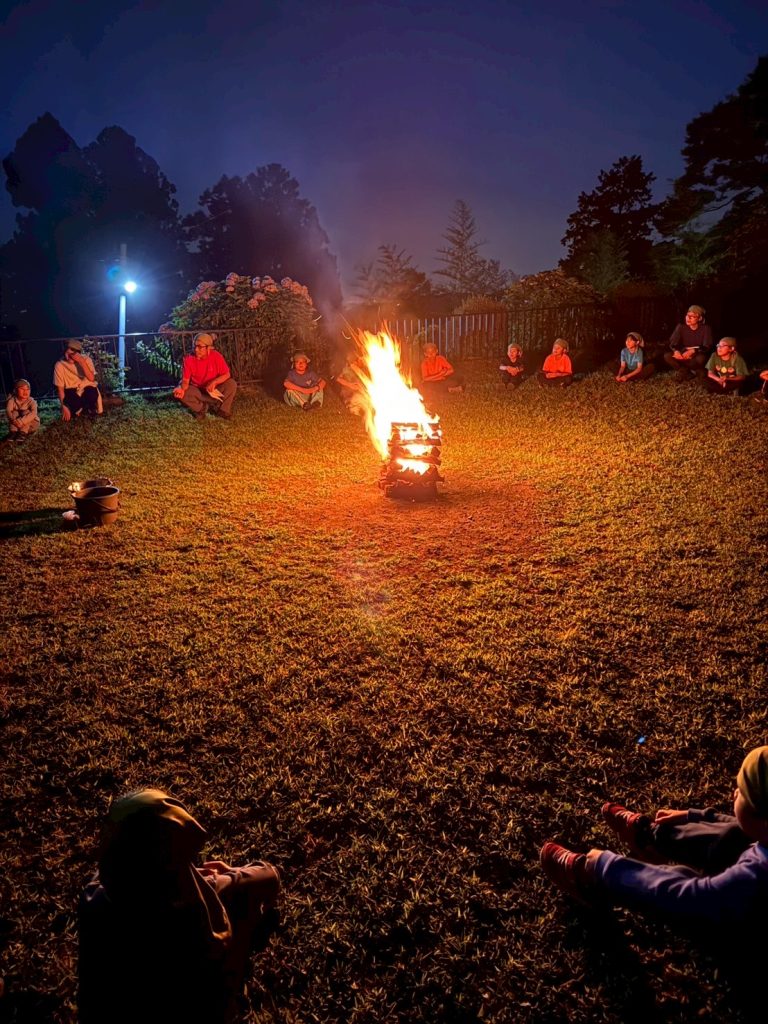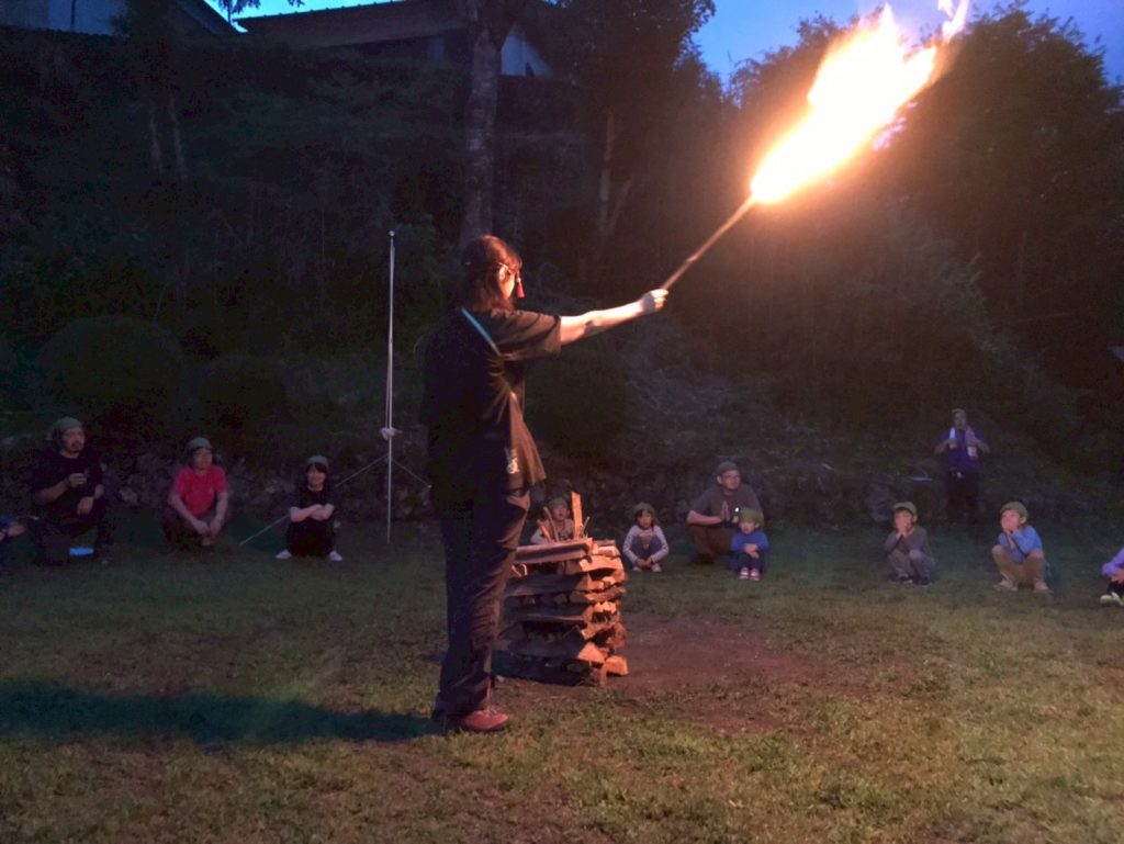 厳かな雰囲気で始まったキャンプファイヤー、皆で夜の歌を歌ったり、準備したスタンツやアクションソングを楽しんだり、スカウトの気持ちは一つになっていきます。充実した一日でした。