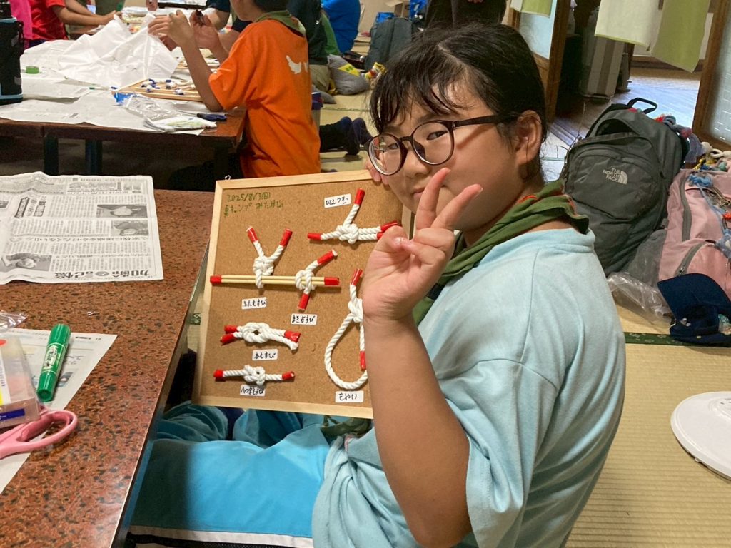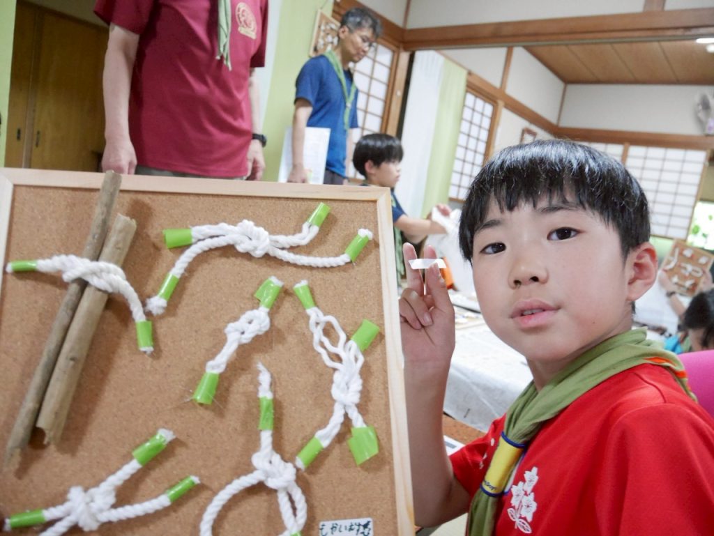 “おさないものをいたわります。”ビーバーたちに八の字結びと本結びを教えました。